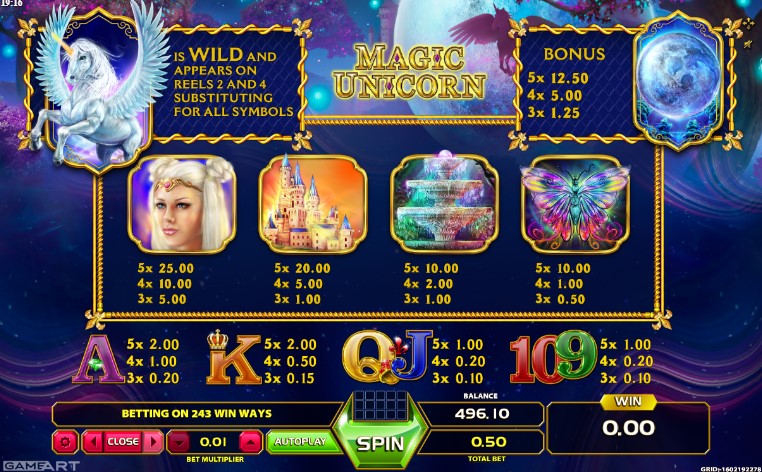 Magic Unicornは、GameARTの魅力的なオンラインゲームです。それはあなたを魔法の夜の森に連れて行きます。満月の下で、それほどとらえどころのない魔法のユニコーンの助けを借りて大きな賞品を獲得することができます。この5リールのゲームでは、243通りの方法で賞品を獲得できます。デスクトップ、タブレット、携帯電話で再生できます。ベットサイズとプレイするライン数を選択するだけで完了です!