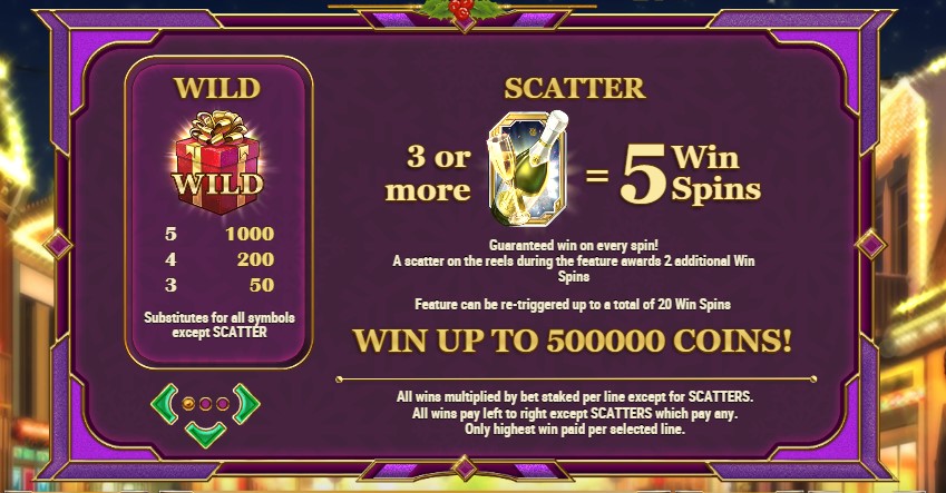ゲームはヨーロッパの都市の居心地の良い通りで行われ、夜間照明で明るく照らされます。ホリデーシーズンのデザインは非常に雰囲気があり、テーマ別の写真を表す美しいシンボルがたくさんあります。休暇を楽しみに楽しむだけです。ビデオスロットのサウンドトラックは楽しくてダイナミックで、楽しいストーリーを有機的に強調しています。スロットはミニマルなゲームプレイを特徴としています。ナビゲーションバーは下部にあります。管理の原則は非常に簡潔であるため、初心者にもアクセスできます。 Linesソフトキーを使用すると、現在のラインが割り当てられます。入札キーは、アクティブな各ベットの入札に責任があります。