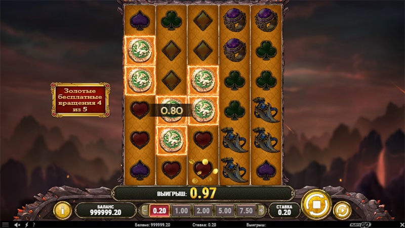 - スキャッター-ペイラインとは関係のないドラゴン。競技場のランダムなセルに2つの散乱が発生すると、再スピンがトリガーされます。リールに3つのスキャッターが表示されると、フリースピンが有効になります。
