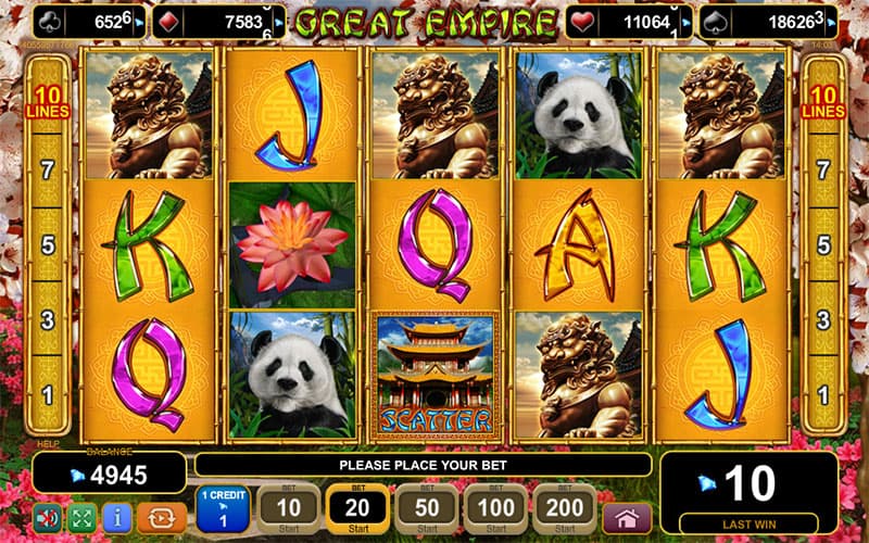 アジアの極東地域に行き、EGTの5リールと3列の大帝国スロットマシンで蓮の花とパンダのクマを追いかけましょう。 Great Empireスロットマシンのレビューを読んで、このスロットの無料バージョンを試して、ボーナス機能と高ペイラインでの勝利の詳細をご覧ください。このレビューの最後まで読み続けると、私たちの評価があなたを待っています。