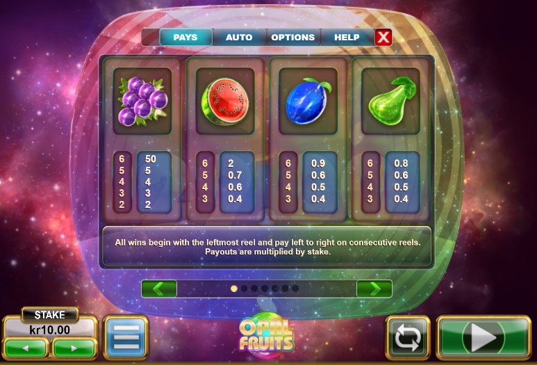 Opal Fruitsは、6リールのビデオスロットで、固定支払いは5625です。 6つのドラムにはそれぞれ3つの列がありますが、上下2つの水平ドラムは、ドラム2と5の間に追加の列を追加します。一般的に、彼らはゲームウィンドウ3-5-5-5-5-3を水平方向に回転するリールで形成しています。